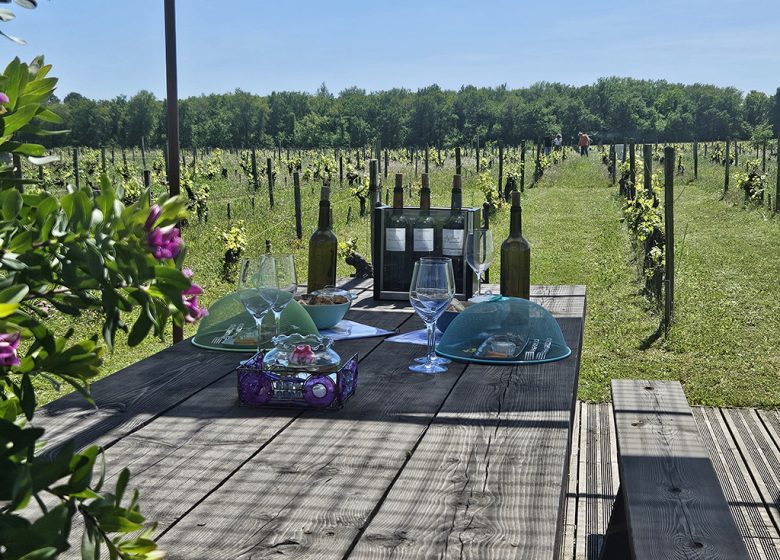 Les amoureux de la nature s’y complaisent. En flânant dans les vignes, nous mettons l’accent sur nos cépages ainsi que sur les techniques d’accompagnement des vignes auxquelles nous croyons : traitements aux infusions de plantes, nichoirs à chauves-souris et mésanges bleues, brebis landaises dans les vignes, tressage... Nous poursuivons attablés entre 2 rangs de vignes, autour d’une assiette de produits locaux, avec la dégustation de 6 vins. Du grand air et du plaisir pour les papilles.
