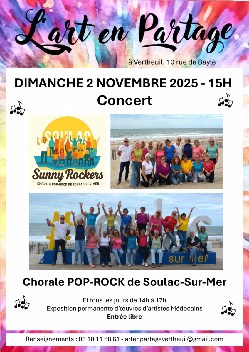 L'Art en partage vous accueille pour un concert de l'ensemble Sunny Rockers, chorale pop-rock de Soulac-sur-Mer.