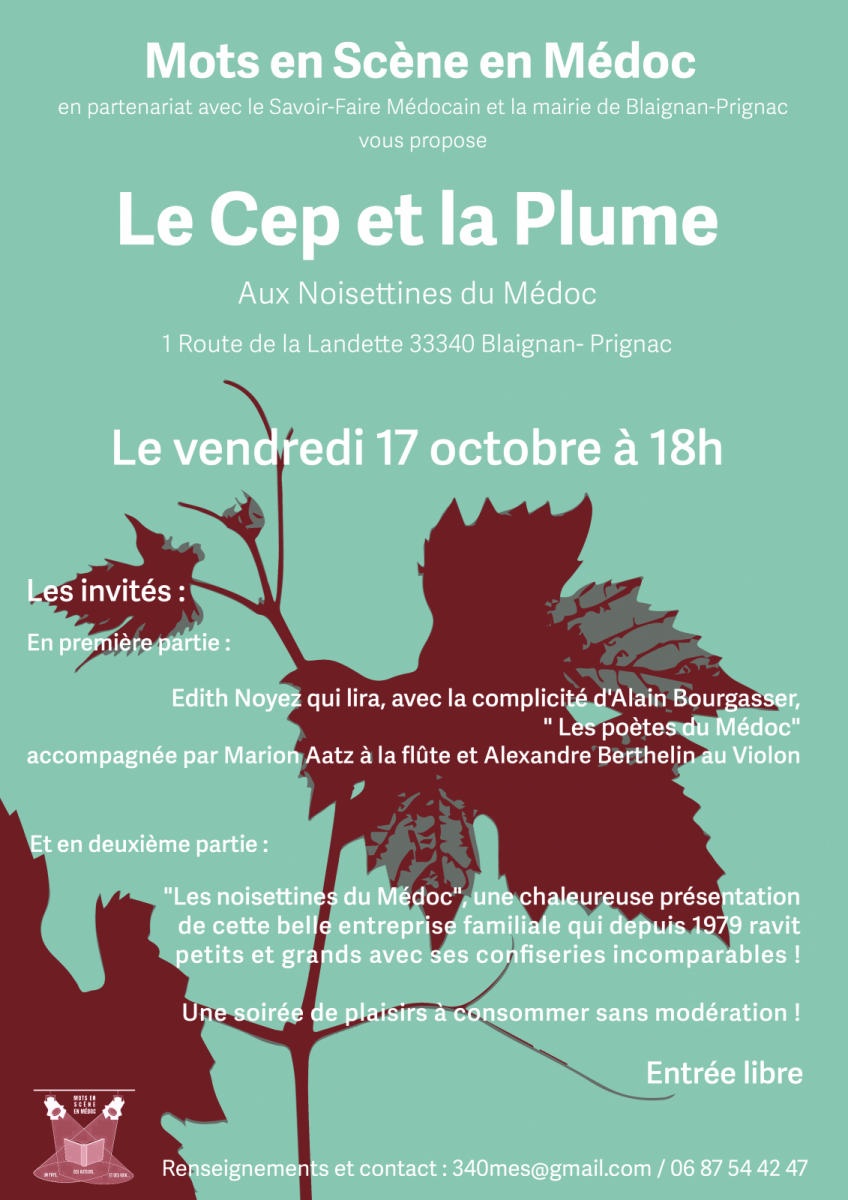 Mots en Scène en Médoc, en partenariat avec le Savoir Faire Médocain et la Mairie de Blaignan-Prignac vous proposent une nouveau RV du Cep et la Plume.