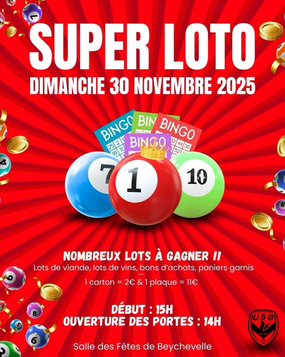 Le 30 novembre 2025 Ajouter à mon Agenda Google Animation et fête locale Salle des Fêtes, 33250 SAINT-JULIEN-BEYCHEVELLE À propos Date Tarifs Informations de contact Retour à la liste L'Office de Tourisme Médoc-Vignoble vous informe : L'U.S Beychevelle organise son loto dans la salle des fêtes de Beychevelle. Ouverture des portes dès 14h. Date Le dimanche 30 novembre 2025 à 15h. Ouverture des portes dès 14h. Tarifs Tarifs Plein tarif le carton 2 € Suivant Précédent