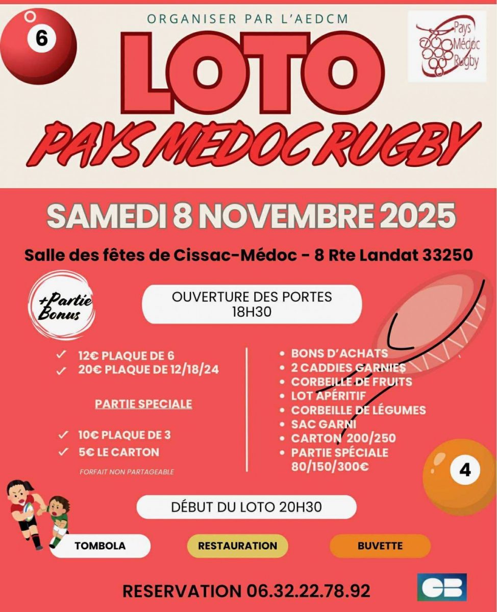 le Pays Médoc Rugby, en collaboration avec l'AEDCM, organise son loto.