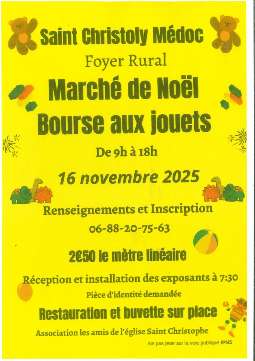 les Amis de l'Eglise Saint-Christophe organisent leur marché de Noël et bourse aux jouets au foyer rural.