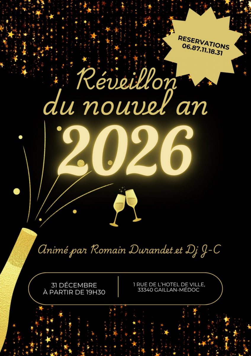 Le Comité des Fêtes organise son réveillon de la Saint-Sylvestre, avec au menu : punch et ses amuse-bouches ; foie gras, pâté en croûte et salade lardons chèvre croustillant ; trou gaillanais ; caille farcie au foie gras et ses légumes croquants ; salade et son fromage ; bûche glacée, champagne et soupe à l'oignon. Vin compris.