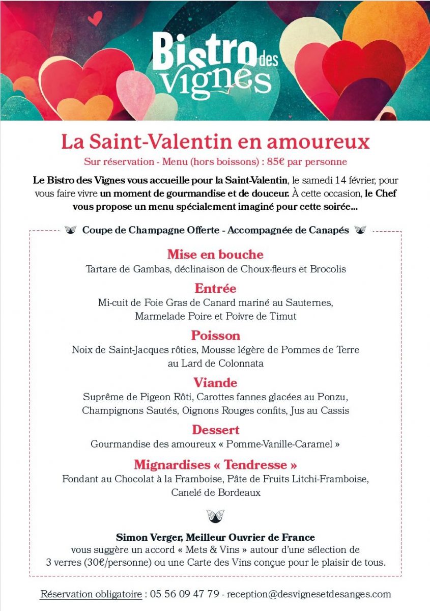 . Un dîner spécial Saint-Valentin avec une coupe de champagne offerte par personne dans notre restaurant le Bistro des Vignes (repas ouvert à tous sans obligation de séjour)
