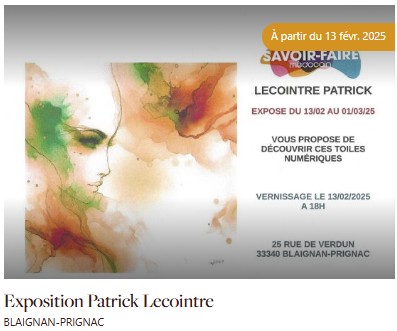 Le vernissage aura lieu le vendredi 14 février à 18h30, à la Maison du Tourisme et du Vin de Pauillac.